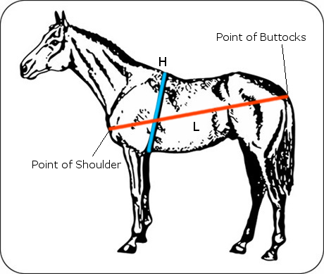First get the pony sanding straight and level, then measure the heart girth (H) using a tape measure that runs tightly around the pony lying at the base of the withers and as close to the front legs as possible.